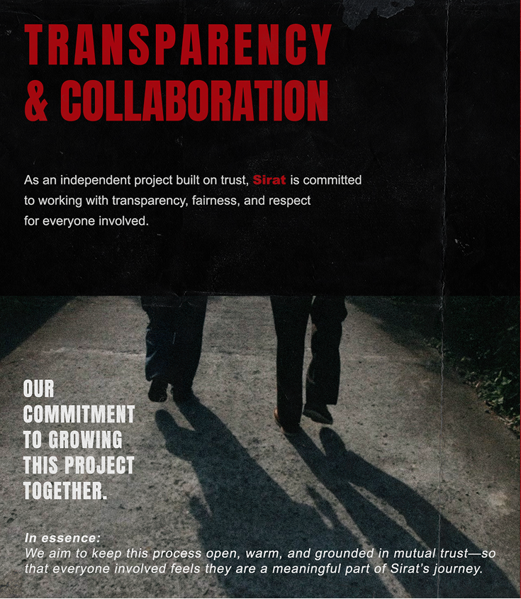 Sirat is an independent film project that is not designed for commercial profit. Because of that, every form of collaboration—whether through resources, expertise, or material support—is welcomed as a meaningful contribution, one that will be acknowledged with respect and transparency, without any financial return scheme.